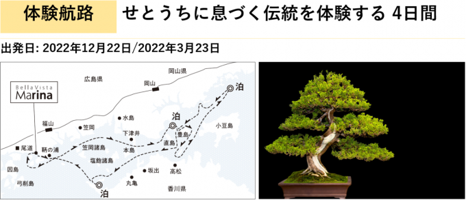 せとうちの伝統文化と技術を2日間かけて体験していただく新しいご提案です。1日目は玉野へ向かい錨泊、2日目は高松にて江戸時代より黒松の育成を行ってきた「高松盆栽」の盆栽家、高松藩主である松平家の保護によって発展した「香川漆器」の生産者を訪れ技法を学びます。3日目は岡山での「備前焼体験」、数々の名刀を生み出してきた「備前長船刀工体験」も予定しています。