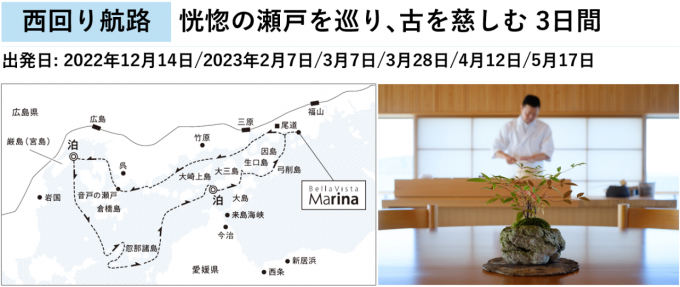 大型のクルーズ船では通航することのできない瀬戸(狭門)の水道やしまなみ海道などを結ぶ個性的な橋の数々をくぐり、少人数だからこそ実施できる早朝の厳島神社参拝や伝統文化・技術にふれる船外体験、そして水揚げされたばかりの鮮魚を漁師さんから直接仕入れるなど、プライベート感覚にあふれた、あなただけの旅。