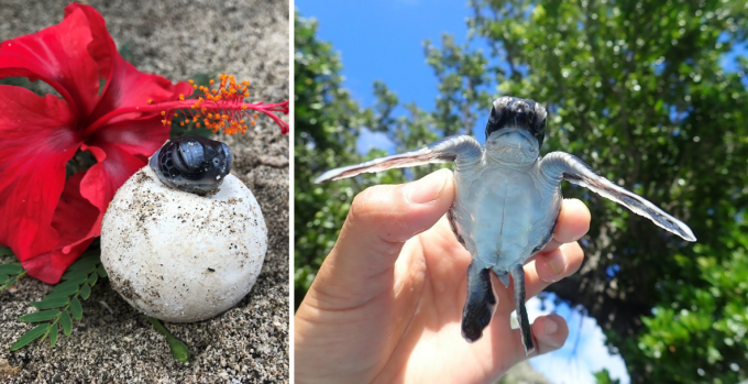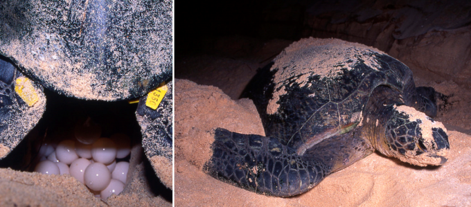 2月~5月ごろ、小笠原諸島へやって来たアオウミガメのカップルは海上でぷかぷか浮かびながら交尾を行います。5月~8月ごろ、母ガメだけが夜の砂浜に上陸し、深さ60センチほどの大穴を掘り、1度の産卵で100個前後の卵を産み落とします。大切な宝物を隠すように丁寧に砂をかけて海に戻ります。これを2週間おきに4~5回ほど繰り返すそうですから、偉大なる母ガメはとてつもないスタミナの持ち主に思えます。