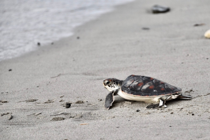 待望の孵化(脱出)は7月~10月ごろに始まります。産卵後2か月ほど経つと自ら殻を破って卵から出てきます。数日間砂の中で過ごした後、皆で協力しあって砂の中から這い出します。赤ちゃんカメの甲羅は4~6センチ程度、昼間に地上に出ると鳥に捕食されたり、太陽の熱にやられてしまうため、砂の温度が下がる夜までじっと待つのです。また、殻の空洞を利用して脱出するため1匹だけではなく、いっせいに砂を掻いたほうが脱出しやすいようです。そして海のわずかな輝きを頼りに、これから始まる大冒険へとすすんでいくのでした。