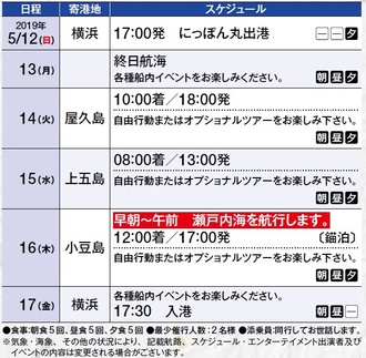 寄港地は「屋久島」、2018年6月に世界文化遺産登録で注目の「上五島」(長崎県、五島列島の北部)、オリーブの島として知られる「小豆島」の島々で、さらに「日本の地中海」といわれる瀬戸内海を早朝~午前中に