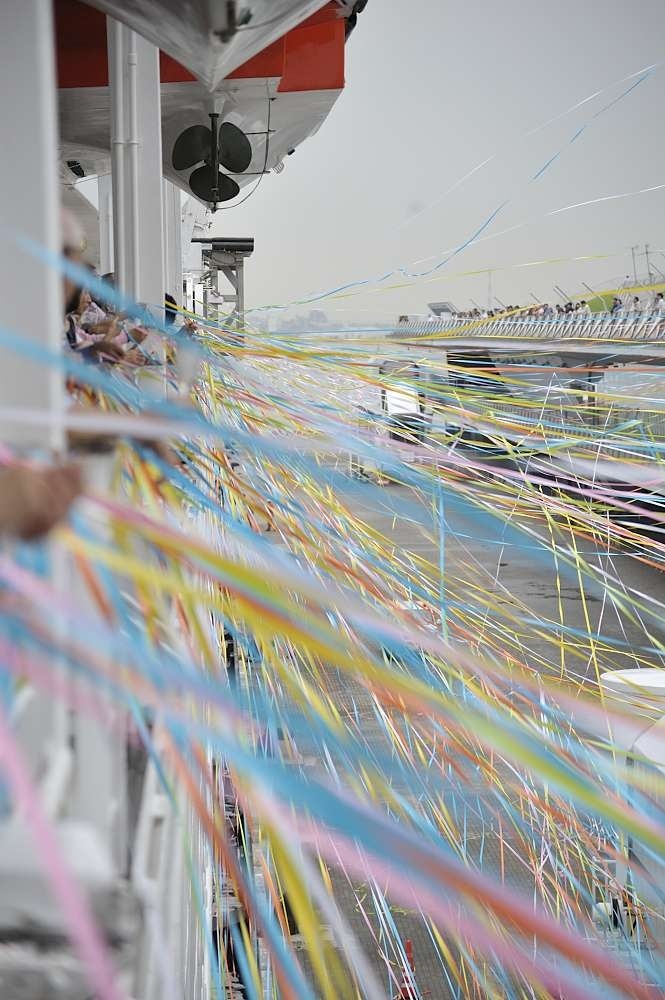 出港の時間は少し風が強かったのですが、船上のお客様が投げたテープがデッキまで届くと、あちこちから歓声が!