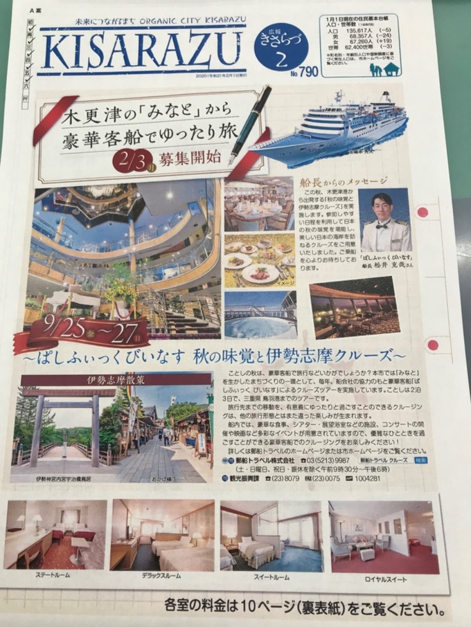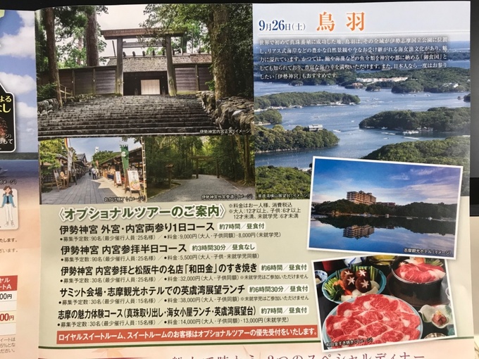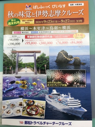 秋の週末を利用した弊社の『客船ぱしふぃっくびいなす 秋の味覚と伊勢志摩チャータークルーズ』をご案内いたします。横浜港を出港後、千葉県木更津港に寄港し、出港時に港で打ち上げられる花火を鑑賞しながら、三重の鳥羽港へ向かいます。2泊3日の短いクルーズではありますが、秋の季節を感じさせる食事、エンターテインメントを満喫してください。木更津市のご協力を得たチャータークルーズは今回で3回目となります。年々、千葉県在住の方がクルーズに乗船されるが増えてきており、弊社としても新規のクルーズファンが増えることはとても光栄です。伊勢志摩はとても魅力ある観光スポットですので、何度、訪れても良き所です。今秋のクルーズ旅行にいかがでしょうか。