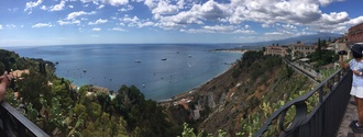 前日の深夜、南イタリアからタオルミーナ入りしたが、長時間のバス移動で1泊目の夜は爆睡。しかし、翌日の観光は晴天の中、活火山のエレナ山を望む数々の観光地(ギリシャ劇場、4月9日広場)を訪れたが、眼下の景色に感動。夜はケーブルカーにて再度、山頂へ登り、今年、サミットが開催された際、阿部首相が滞在したホテルのバーで夜景を見ながらイタリアワインを。しかし、深夜に近い時間帯ではあったが、山頂のウンベルト通りは観光客でごった返し、、、スリには用心、用心。