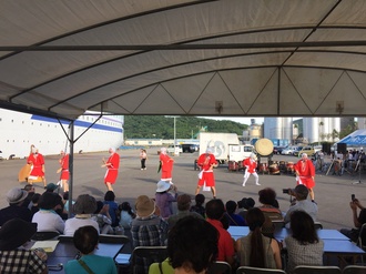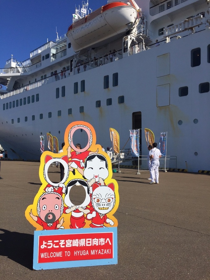 晴天に恵まれた細島港の出港時、岸壁では地元の方々のひょっとこ踊りを鑑賞。初めて見る踊りでしたが、お面の顔がユニークだけに、微笑ましい気持ちになれました。