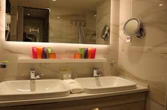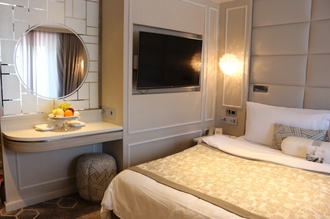 クリスタル・シンフォニーの客室は全室が海側で深めのバスタブがついており、日本人スタッフが乗船、日本語船内新聞があり、キャビンに浴衣があったりと、クリスタル・クルーズならではの日本人に嬉しいサービスも健在です。