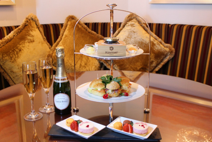 飛鳥Ⅱが提供するのはLaurent-Perrier La Cuvée(ロ ーラン・ペリエ ラ キュベ/シャンバン・ハーフボトル)、キャビアと薬味、サーモンのクロワッサンサンド、生ハムのミニバーガー、ストロベ リームース、マカロン、そして紅茶。価格はお二人で13,200円(税込)です。