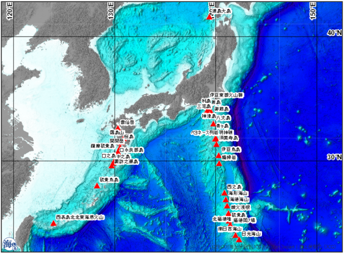 これらの島々と岩礁は言うなれば海上から見える、“氷山の一角”。海の下には新たな陸地を生み出すエネルギーを秘めた急峻な火山が聳え、連なっているのです。離島の海底からの高さを測るのは地形が複雑なため容易ではなく、比高(注:海底の中の近くの平地と比べる)で表示されることが多いようです。最高峰地点の海上の高さは国土地理院地図を参考にしています。