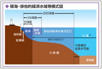 領海の基線からその外側200海里(約370km)の線までの海域で領海を除きます。並びにその海底及びその下です。