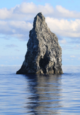 伊豆鳥島の南約76kmの海上に忽然と孤高の姿を現すのは「孀婦岩(そうふがん)」。海上からの高さ100mほどで、ザトウジジラがジャンプしたような形をしています。この岩、実は海底から2,500mもある火山の頭頂部なのです。柱状節理も観察でき、第四紀火山(約180万年前から現在まで活動している火山)とされていますが詳細は不明です。
