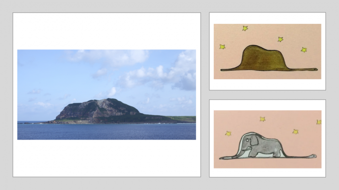 そこで、硫黄島の画像を探していますと、ふと「星の王子さま」の挿絵が思い浮かんだのです。そう、海上から見るとまるで象を飲み込んだヘビのよう!上空から見ても平べったいツチノコ?に見えてしまいます。