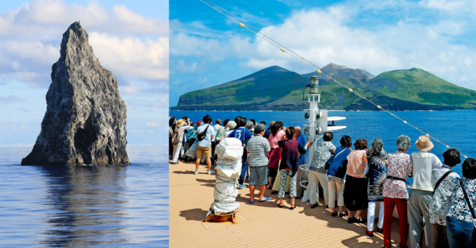 それもあって、クルーズの目的地には最適、今回ご紹介した硫黄島まで南下する航路を行うクルーズは少ないのですが、小笠原までには途中、海上に忽然と現れる孤高の姿が印象的な「孀婦岩(そうふがん)」やかつては有人離島で羽毛の採取が行われていた「伊豆の鳥島」付近を航行します。