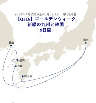 そんな中、郵船トラベルでは2023年の【Q316】ゴールデンウィーク新緑の九州と韓国9日間の海側バルコニーのお部屋を追加仕入れいたしました。ぜひこの機会にゴールデンウィークの過ごし方のひとつとしてご検討されてはいかがでしょうか。それでは、スケジュールや現時点でお取りできる可能性のあるお部屋をご案内いたします。
