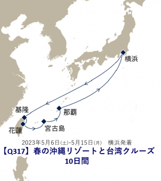 クイーン・エリザベスは2023年、2024年と季節のよい春から初夏にかけてゴールデンウィークをはさみ、日本発着のクルーズを実施します。2023年5月6日(土)出発の【Q317】は当初の予定を変更し、沖縄と台湾を楽しむクルーズとして装いも新たに航路発表となりました。大変魅力的な航路で、すでに多数のお問合せを頂戴しております。人気の上級客室は少し空室がございますのでご検討されてはいかがでしょうか。