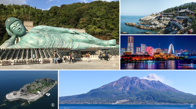 初めての寄港地、鹿児島では②桜島の雄姿を眺めつつ市内一番の繁華街「天文館」へ。かき氷に練乳とフルーツがトッピングされた大人気スイーツ「しろくま」を味わうのもいいですね。次に韓国へ、釜山ではカラフルな「甘川洞文化村」散策や海沿いの③「海東龍宮寺」を訪れるのもおすすめ。博多港からは世界最大級の釈迦涅槃像のある④「南蔵院」を訪れたり、夜は22:00出航なので屋台を楽しむこともできます。そして最後の寄港地、長崎では足を延ばして世界文化遺産に登録された⑤「軍艦島」を訪れてみてはいかがでしょうか。5社がクルーズを行っています。