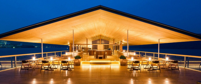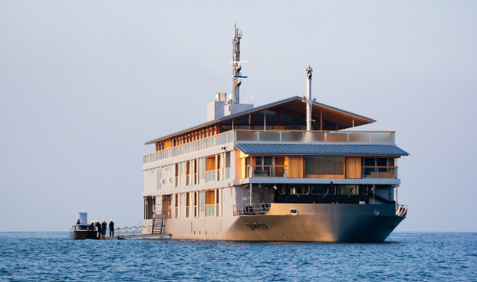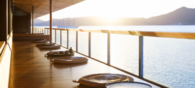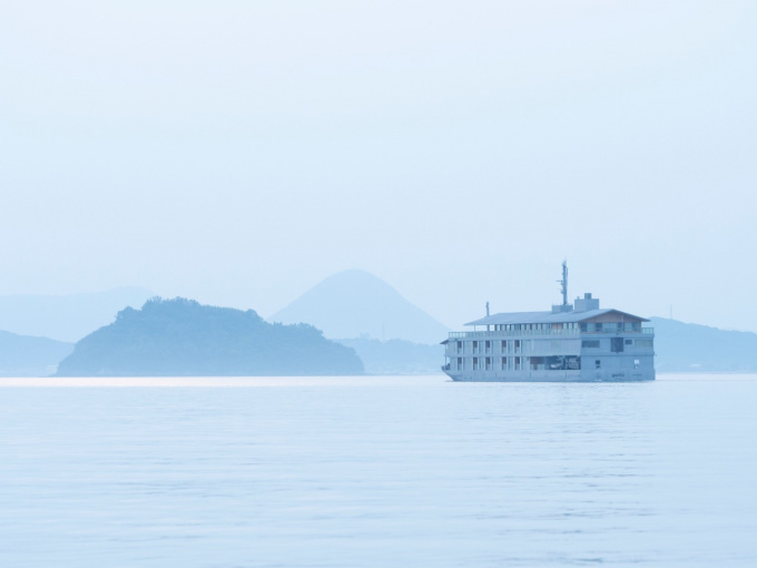 船内に戻れば暮れゆく瀬戸内海の風景が彩を添える新鮮な海の幸ディナーに舌鼓、大きなガラス窓に映る夕景を眺めながら浴場で旅の疲れを癒し、火照った体は海風に吹かれながら縁側でクールダウン。感性にひびくアート体験と瀬戸内海の恵みに抱かれる極上の旅をお過ごしいただくことができます。ガンツウのサービスやお食事などについてはこちらのブログをご覧ください。