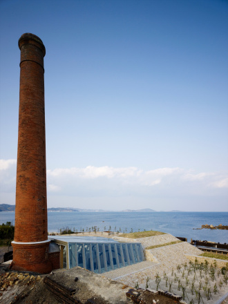 それでは「犬島精錬所美術館」を訪れてみましょう。宝伝港からフェリーで10分、犬島港から海沿いを南へ徒歩数分、すぐ目に飛び込んでくるのが煉瓦造りの煙突。ところどころ剥がれ落ちた黒い煉瓦の道をすすむと煉瓦の壁の合間にガラスの建物が見えてきます。現代と過去が入り混じった不思議な空間を作っています。整備された「犬島精錬所美術館」の建築は、地形、近代化産業遺産、自然エネルギーを活用することで犬島という環境の絶え間ない自然のサイクルの一部、地球のディティールの一部として変化、成長していく施設であるといえます。