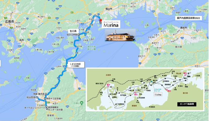 生口島よりしまなみ海道を北上、尾道に向かい、ガンツウの待つベラビスタマリーナにすすみます。今回は2つのクルーズを連続で乗船していただき、瀬戸内海を縦横無尽にクルーズ、注目は瀬戸内国際芸術祭2022が開催されているベネッセアートサイト直島、豊島、犬島、女木島、男木島への上陸。大型船では味わえない瀬戸内海の小さな島々へご案内します。