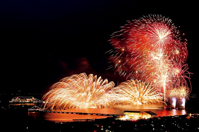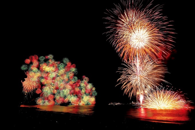 花火大会は数あれど、鏡のような海面に花火の輝きが映り込む幻想的な美しさは他ではなかなか見られません。
