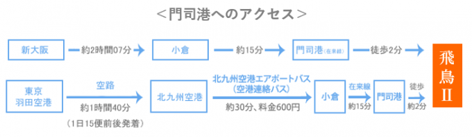 さて、門司港ってどうやっていくの?とお思いの方もいらっしゃるかもしれません。門司港があるのは福岡県北九州市、便利な新幹線の駅は「小倉」。JRの在来線に乗り換えて門司港駅で降りたら目の前に飛鳥Ⅱが停泊しています。