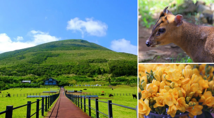 左:八丈富士ふれあい牧場 右上:八丈植物公園のキョン 右下:フリージア