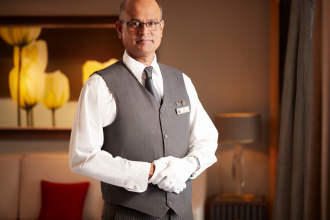 「名探偵ポアロ」の舞台は1930年代の英国でしたが、現代のバトラーはクルーズ船で活躍しています。クイーン・エリザベスはQ1~Q6のクイーンズ・グリルのお部屋だけ、ルームチュワードに加え、バトラーサービスを行っています