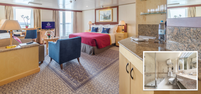 クイーン・エリザベス Q6のお部屋 右下はバスルーム(お部屋は一例です)