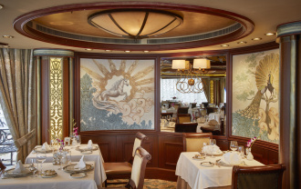 そこで今回は、特別な時間を提供してくれる最高位のお部屋、クイーン・エリザベスのクイーンズ・グリルでの滞在をご紹介します。まず、クイーン・エリザベスの乗客定員は2,081名、内クイーンズ・グリルは132名(2名1室利用の場合)、お部屋数にして66室だけ。キュナード社は航空機輸送が行われる前、英国/米国間の移動手段としてオーシャンライナーを運航していました。当時の階級制度を現代の「ライフスタイル」に置き換え、お部屋によるダイニングとパブリックエリアの区別を行っています。