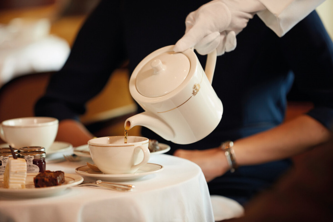 柔らかなハープの音色が隅々まで行き渡るクイーンズ・ルーム、白手袋のウェイターが恭しく紅茶を注ぐ優雅なひととき、クイーン・エリザベスでのアフタヌーン・ティーはとりわけ英国らしい時間が過ごせる午後のお楽しみです。さてこの画像、英国王室御用達の品が少なくとも2つ、写っているのですがお分かりになりますか。