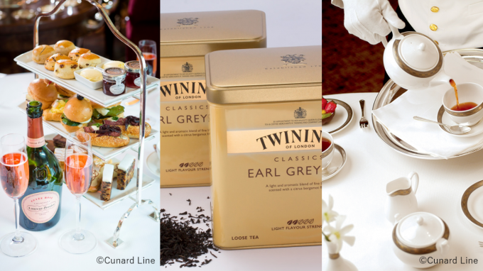 キュナードの客船ではトワイニング紅茶を使い、数々のフレーバーをお楽しみいただけるのですが、特に女性に大人気のブレンドティーはベルガモット(地中海産の柑橘類)の香りをつけたアールグレイ(Earl Grey)。当時海軍大臣を務めていたグレイ伯爵が、中国からの土産物として味わった紅茶を大変気に入り、トワイニング社に味や香りの再現を依頼した一品。のちに英国首相となった伯爵の名を冠した紅茶です。「アール」は英語で「伯爵」を意味します。