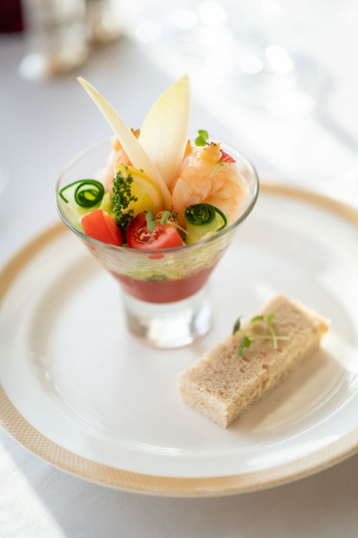 インスイートダイニングではレストランのお料理をお食事のすすみ具合を確認してご用意します。時にはグリルクラスのお客様専用のコートヤード(屋外)で潮風に吹かれながらのランチ、星空を眺めながらのディナーはいかがでしょうか。過行く風景がお料理に船旅のスパイスを加えます。