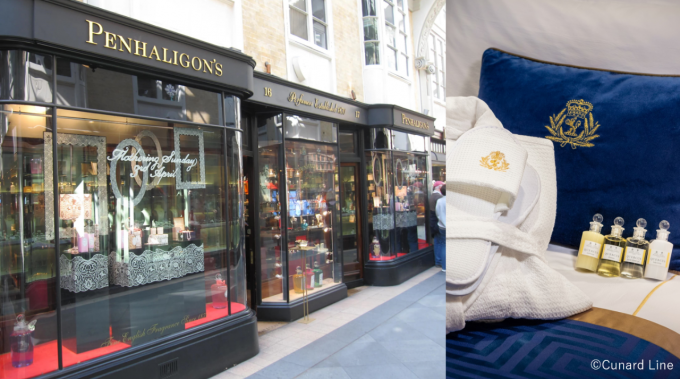 1870年に創業した香水メーカーペンハリガンはビクトリア女王に仕えた宮廷理容師兼調香師でもありました。1903年にアレクサンドラ王妃からロイヤル・ワラントを受け、現在は二つの称号を保持しています。英国王室に深いかかわりを持つ歴史あるブランドでキュナード社の雰囲気にお似合いと評されています。