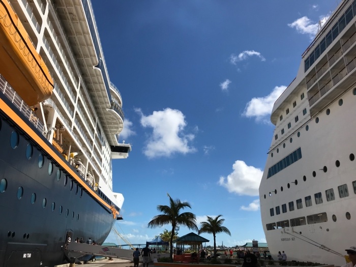 バハマ船籍の船が多いことで知られるように、バハマはクルーズ船のメッカ。船がナッソーのあるニュー・プロビデンス島に近づくにつれ、同じくナッソーに向かう他のクルーズ船が並走する船影が見えてきて、港では仲良く並んで停泊したり。きらきらと華やかなクルーズ船が次々と発着する様子は圧巻です。