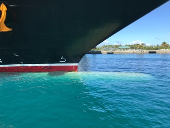 バハマ諸島は2,400の岩礁からなるほぼサンゴ礁の群島。海は船の喫水線下が透けて見えるほどの透明度。