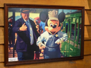 作業着を着ていますが、元々この列車は刑務所の囚人が使っていた木材運搬用の鉄道を観光鉄道にしたとかで、ミッキーもそれに合わせていつもと違う服を着たようです。