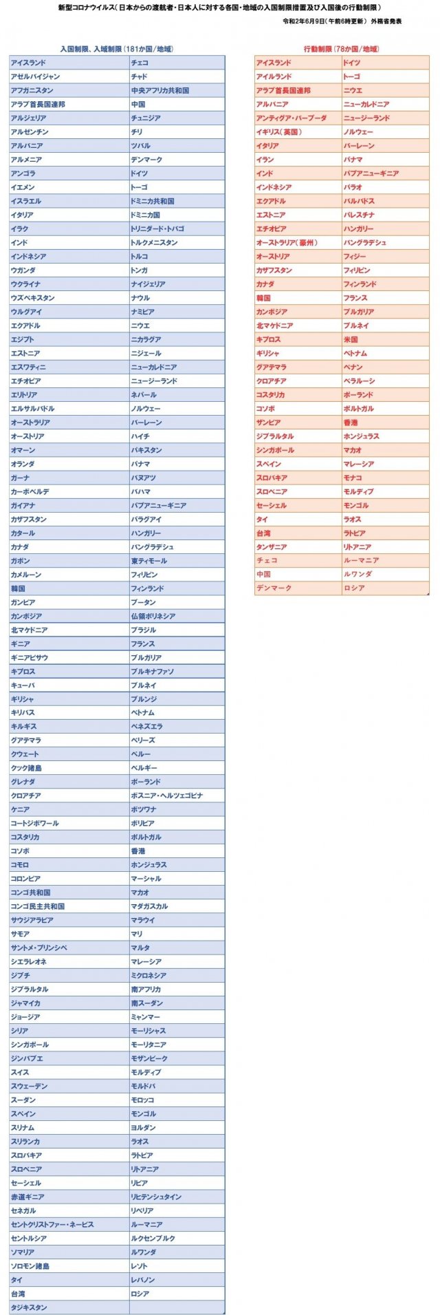 コロナウイルスの感染拡大に伴う各国の日本国籍者に対する入国制限、行動制限措置について、6月9日午前6時現在での外務省発表データをまとめております。