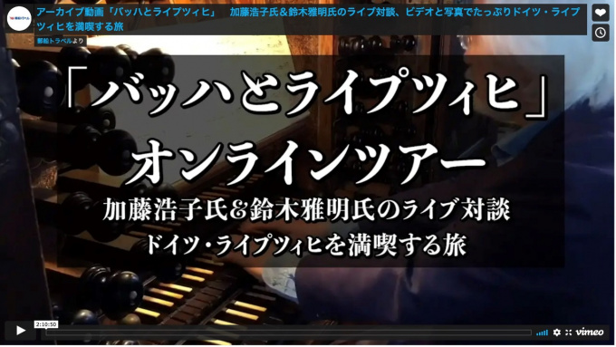 昨年12月には、第1弾として「バッハへの旅 オンラインツアー」を催行。「バッハへの旅」で周遊するバッハゆかりの街々を写真を交えてご紹介した後、ゲヴァントハウス管弦楽団コントラバス奏者のエーバーハルト・シュプレーさんにライプツィヒのバッハゆかりの地をご案内いただいたり(録画)、聖トーマス教会オルガニストのウルリヒ・ベーメさんが、聖トーマス教会のバッハ・オルガンでバッハ作品を演奏した動画を盛り込んで、88名さまのご参加をいただくことができました。