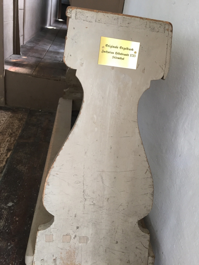 このオルガンは、バッハとヒルデブラントが知り合うきっかけを作った重要な楽器でした。1723年11月2日、新しくなった教会堂と一緒にこのオルガンが完成した時、バッハが鑑定をし、カンタータ194番《こよなく待ち焦がれし喜びの祝い》を演奏しているのです。教会には、その時にバッハが座ったと伝えられるベンチが残っています。