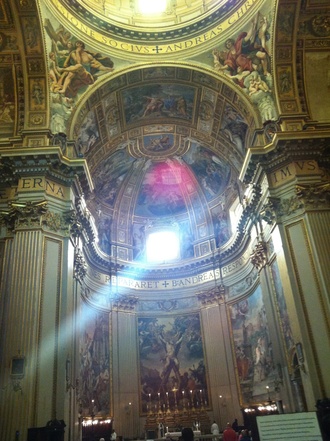 第1幕の舞台となっている聖アンドレア・デッラ・ヴァッレ教会は、17世紀半ばに完成したバロックの教会。正面は質素ですが、内部は大理石と金箔をふんだんに使い、色鮮やかなフレスコ画に飾られた華麗な空間です。バチカンのサン・ピエトロ寺院の次に高いという丸天井(クーポラ)から降り注ぐ光が、堂内に荘厳な雰囲気を添えます。