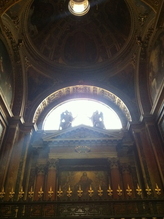 カトリックの教会には、よく、教会とつながりが深い名家一族(有力な檀家のようなものでしょうか)の「礼拝堂」があります。《トスカ》第1幕には、「アッタヴァンティ家の礼拝堂」が登場しますが、モデルになったのは「バルベリーニ家の礼拝堂」。現在その礼拝堂には、《トスカ》の舞台のモデルになったという説明があります。