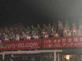 ひょんなことから岡山県の井原市にある美星吉備高原神楽民俗を鑑賞する機会を得ました。横笛と太鼓だけで10数時間の舞を披露することもあるとか、、、楽譜なく、長年の練習・実演で音が身体の一部になっているのだろう。昔から受け継がれてきた「舞」は、人口減少が深刻化する日本でどのような形で残されていくのでしょうね。ちょっと感慨深くもあり。そして、その夜、倉敷市内を散策していたら、おっ!と、101匹以上?の