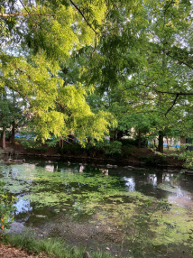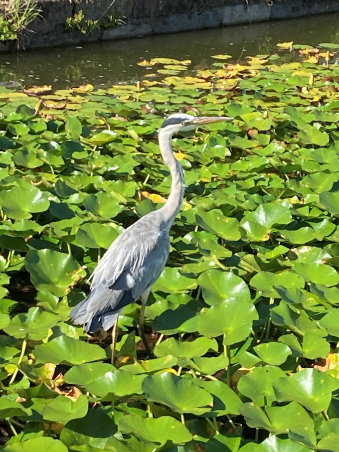 今年の梅雨はあっという間に、あっけなく終わると今度は容赦ない暑さに頭がクラクラ。早めの猛暑かと思えば、梅雨の終わり頃のように雨が続いたり、それもまた厄介です。運動不足解消のための散歩も暑すぎるとさぼりがちになります。冬から春の散歩時に近所の公園や川辺で出会った野鳥たちですが、冬鳥が多かったようなので夏になったら、果たして彼らはどうしているのか気になり、久しぶりに訪れてみました。まず池には水草が生い茂り、木々は青々とし、雑草さえも茂っており、春からも様相がすっかり変わっています。あれほど見かけたキンクロハジロは全く姿をみせず、そうそう、冬鳥のためどこかに移動していったようです。今年の夏、アオサギは空には飛んでるのを見かけますが、池に降り立つのは時々です。池の水もぬるくて居心地が悪いのかもしれません。